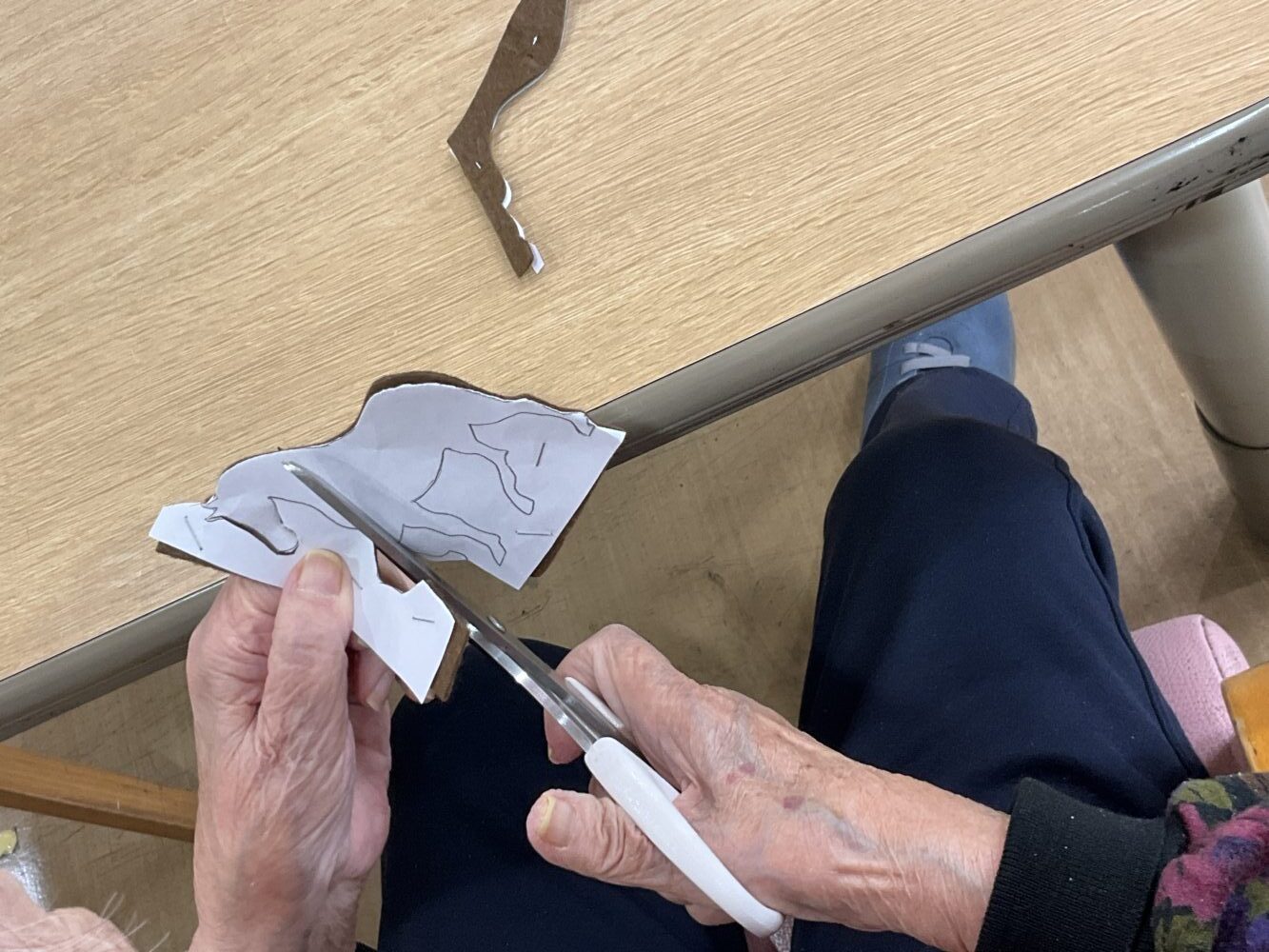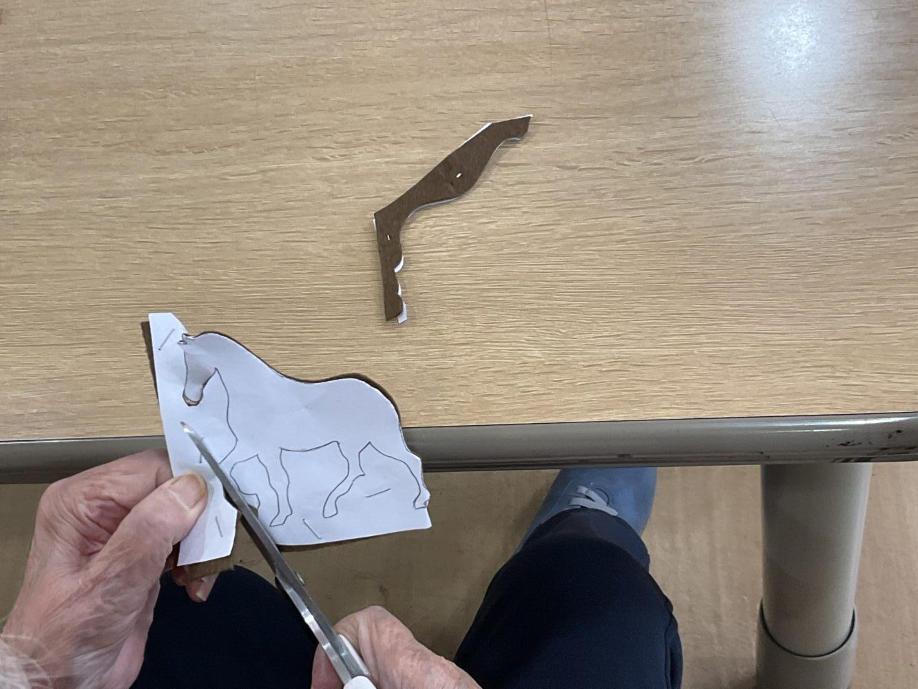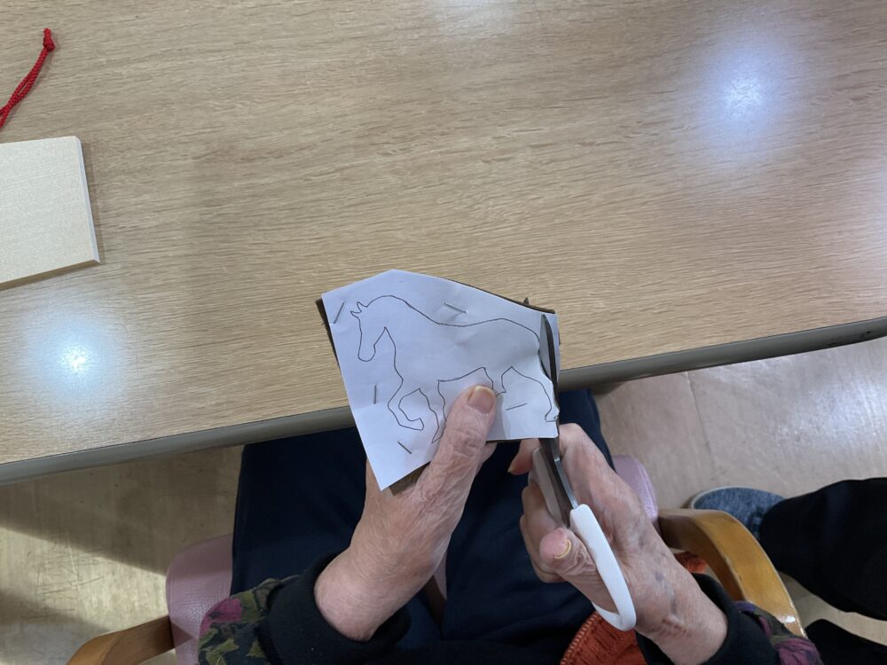 馬の絵が描いてある紙の下にフェルトをしいて、ハサミでちょきちょき線に沿って切っていきます🎵
