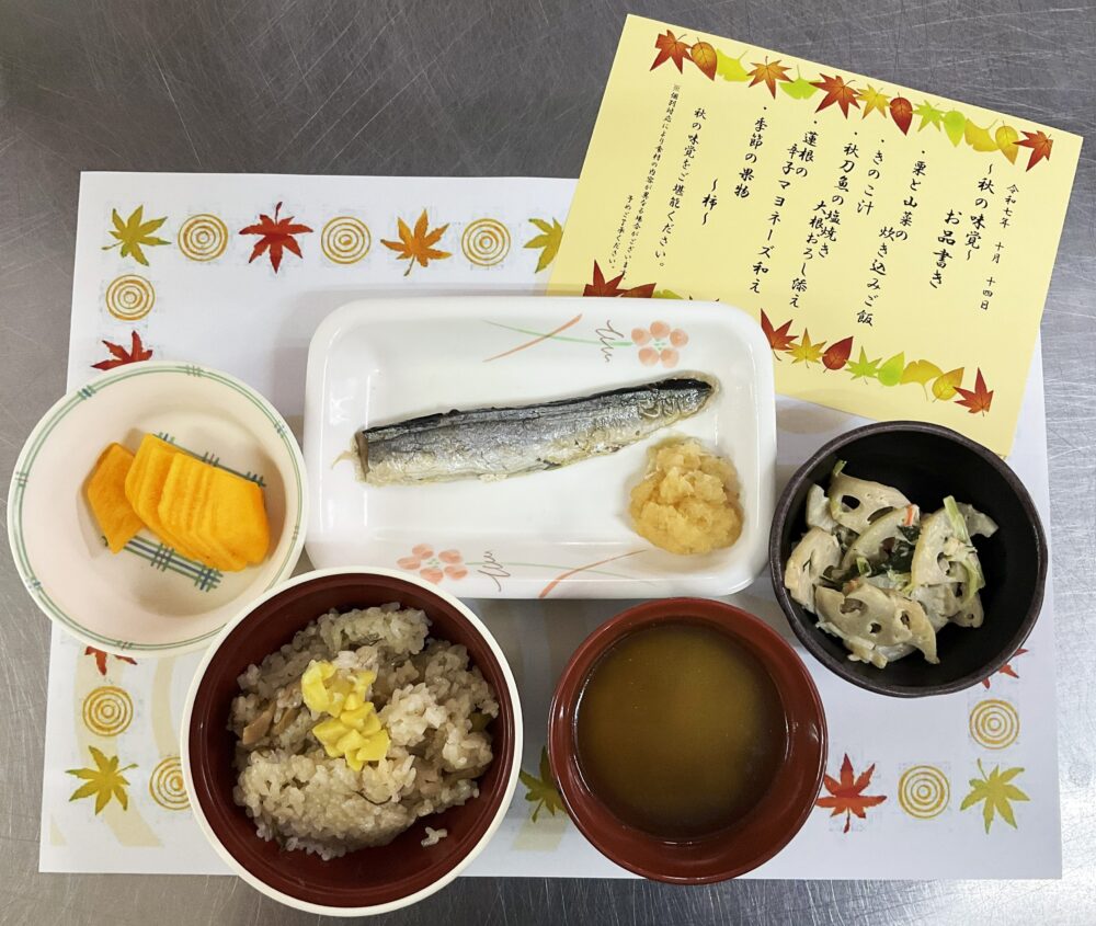 「秋」という実感があまりない気がしますが、施設では秋の味覚を味わっていただこうと、本日のお昼のメニューは「秋」メニューを召し上がって頂きました!