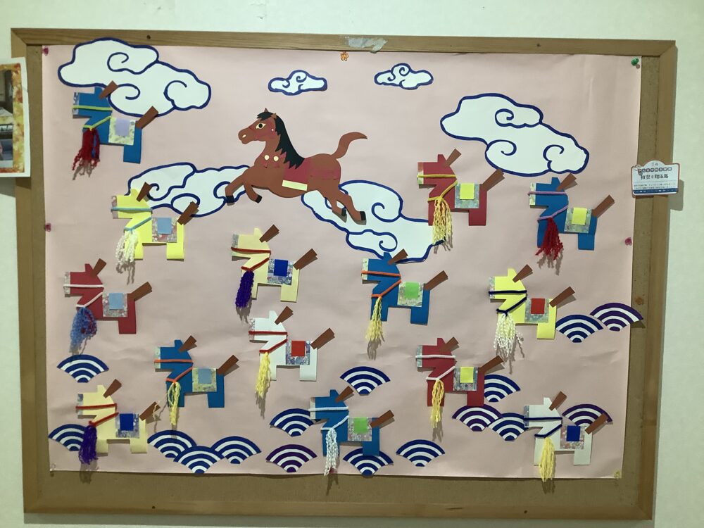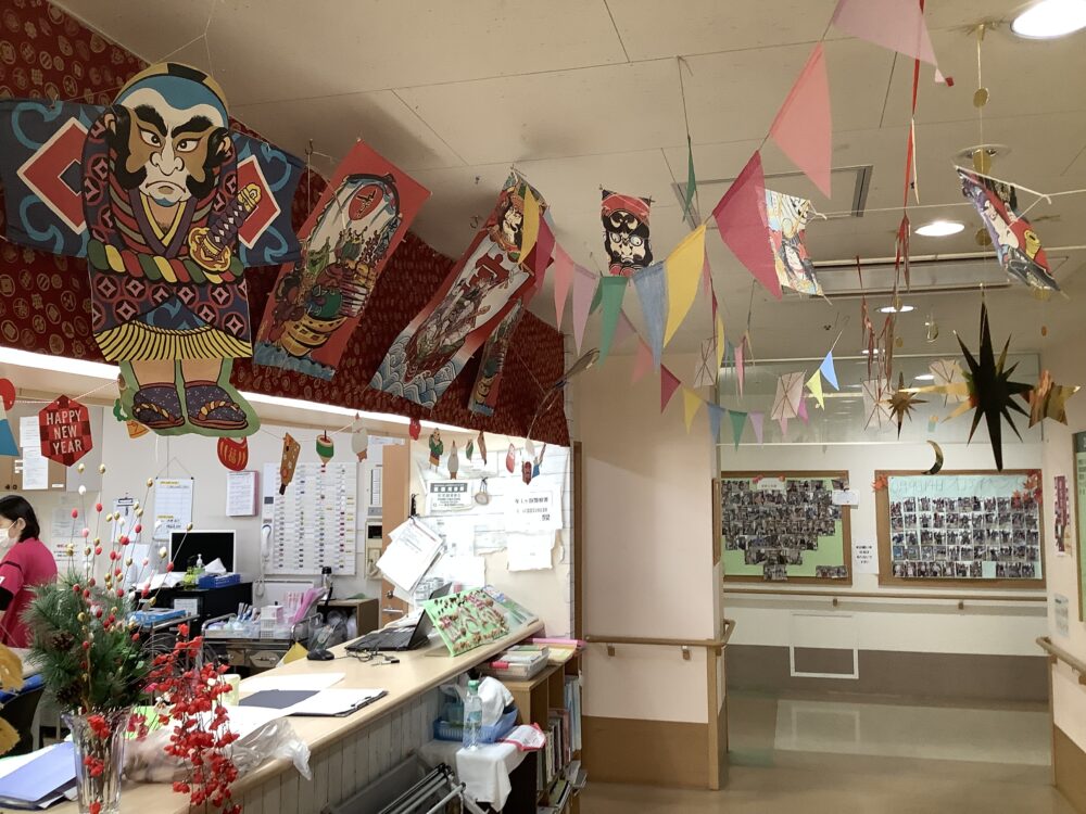 フロアで1月の飾りつけや、レクリエーションの作品を掲示していましたので撮影してみました(*´▽`*)