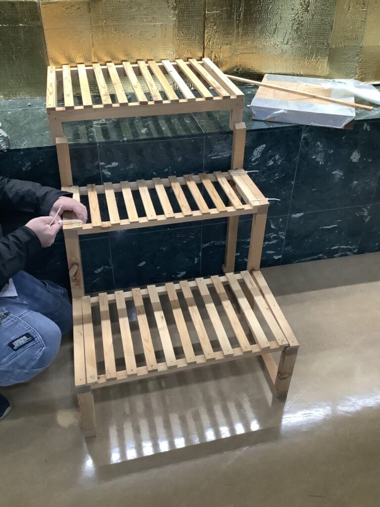 左が鳥居で、右はひな壇のような棚ですね、まだどういった感じで完成するのかは見えてこない状態です(*‘ω‘ *)